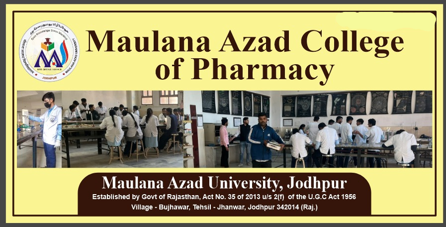 Maulana Azad College of Pharmacy (PCI code-8326) is a part of globally recognized Maulana Azad University, Jodhpur, India which was established in year 2013 vides Rajasthan State Government Act No. 35 (2013). Maulana Azad College of Pharmacy was established in 2023 to set a touchstone in field of Pharmaceutical education starting its journey with the Diploma in Pharmacy Program in the inception of its journey. The programme put into ideas the most novel and progressive teaching, conjointly with basic formulation, synthesis, concepts of Community Pharmacy, Social Pharmacy & Hospital Pharmacy as prescribed by the Pharmacy Council of India. We have renowned faculty members with expertise in basic and applied pharmaceutical sciences, and who epitomize interdisciplinary training and research and are committed to training the next generation of Pharmacists aspiring to be the part of as many sectors and departments whichever may contain them for the noble service of Pharmacy.