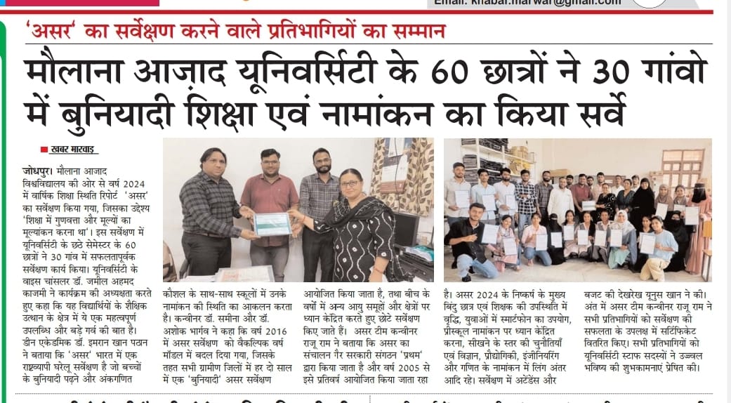 Maulana Azad University, Faculty of Education is dedicated to excellence in teaching, research and professional development in fields of Education. The Faculty came into being in 2017. The Faculty offers a wide range of undergraduate, post graduate and doctoral programmes designed to prepare future educators, with the knowledge, skills, and ethical grounding required to thrive in diverse educational settings.